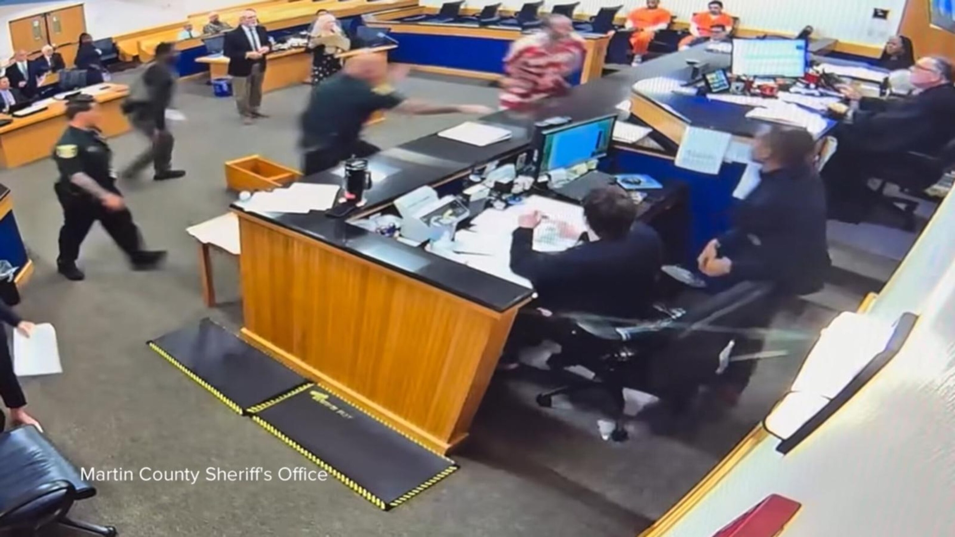Categories Articles Suspect appears to lunge at judge in Florida courtroom during hearing Post author By Mike Nova Post date September 11, 2025 During a routine hearing, an inmate appears to lunged at a judge in a Florida courtroom. Court officers de-escalated the situation, bringing the inmate to the ground.